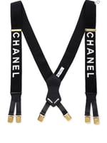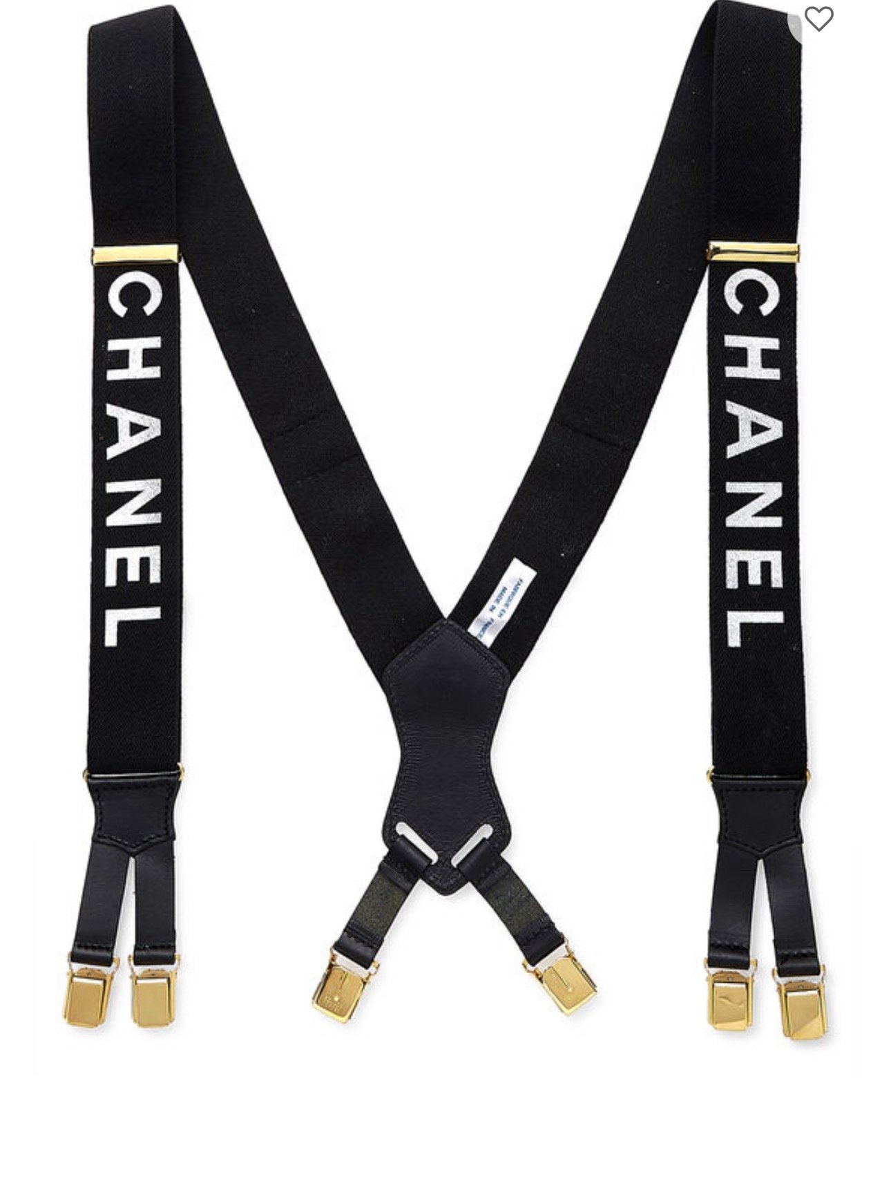 With leather tips on each suspended clasp and embroidered stitching CC in center of suspenders.
